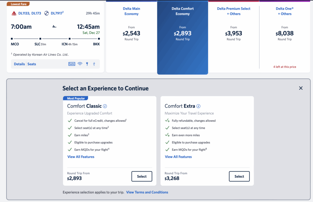 Overall, I think the service in Delta Comfort Plus has gone down from when it was first introduced almost 10 years ago. And it seems that service is now focused on a new business class seat, Premium Select, in-between Comfort Plus and First Class or Delta One. The pricing also seems to have changed this year, going from Comfort Plus, to a choice between Comfort Classic and Comfort Extra. To me, it seems to be a little bait and switch with the price, with the only really noticeable difference is if the ticket is fully refundable or if you just get a flight credit if you need to cancel. (Almost $400 just for a refundable ticket? No thanks.)