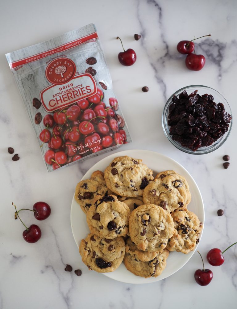 These cherry chocolate chip cookies are the perfect blend of tart and sweet. Cherries and chocolate go so well together, and when combined in a cookie they are irresistible! Especially when incorporated with the buttery flavor of a crisp cookie. We enjoyed partnering with Montmorency U.S. Tart Cherries to create this recipe to highlight a delicious way to enjoy U.S.A. produced dried cherries. And we hope you enjoy it too!