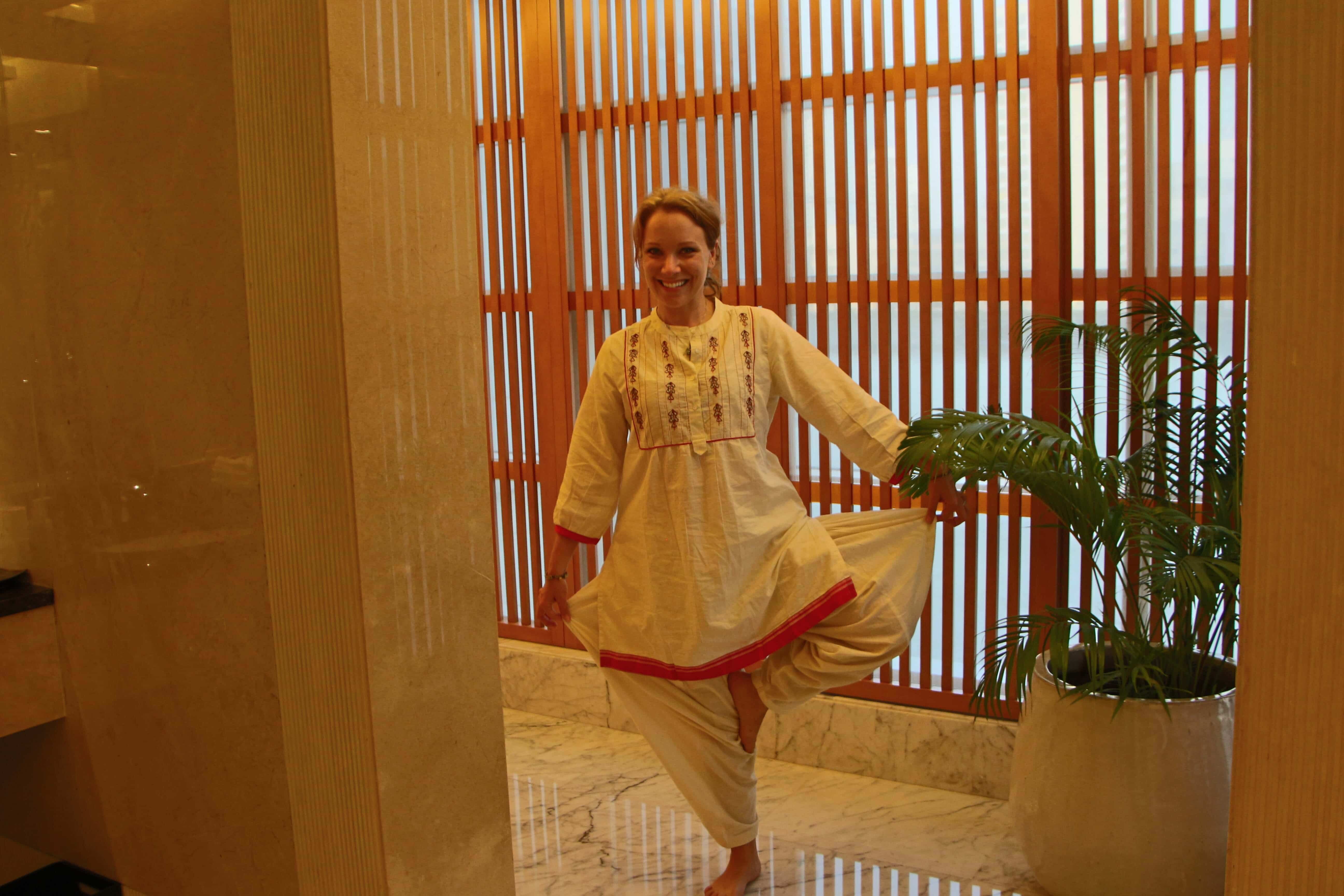While I was visiting Mumbai on assignment for the Four Seasons Private Jet Experience, I had the opportunity to take a yoga class. Since we were mid-way through a 22 day trip, my muscles and back were aching for some yoga and stretching. Only, of all time times I didn’t pack any yoga pants, it was now. I told the concierge at the Four Seasons Mumbai that I needed to find some yoga clothes and asked where I might be able to get some. (Didn’t see any Gap stores or Lulu Lemon during my walking tour, that’s for sure.) But this is India! Surely there’s some yoga clothes at a shop nearby. The concierge said don’t worry, asked my sizes, and said that she’d take care of it for me. This is what I found in my room …